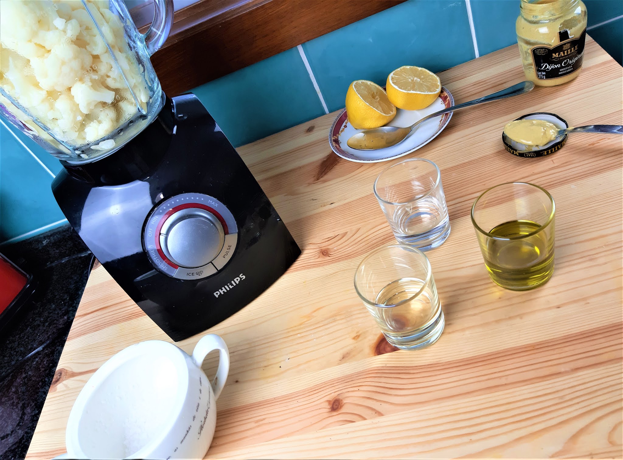 Num liquidificador junte a couve-flor já cozida e escorrida, o suco de limão, a água da cozedura, a mostarda, o óleo, o azeite e tempere com sal. Ligue a liquificadora e bata até obter uma consistência lisa e homogénea, com aspeto de uma maionese.